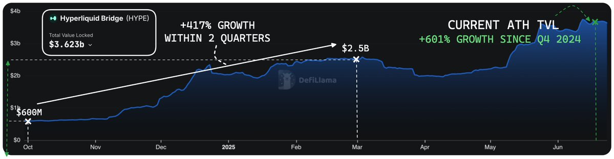 这一反转主要得益于 Hyperliquid 的爆发式增长,其总锁仓量 (TVL) 从 2024 年第四季度的 6 亿美元飙升至 2025 年第一季度末的 25 亿美元,增幅高达 417%。截至目前,Hyperliquid 的桥接存款已创下 36.2 亿美元的历史新高,相较于第四季度基数增长了 601%。
