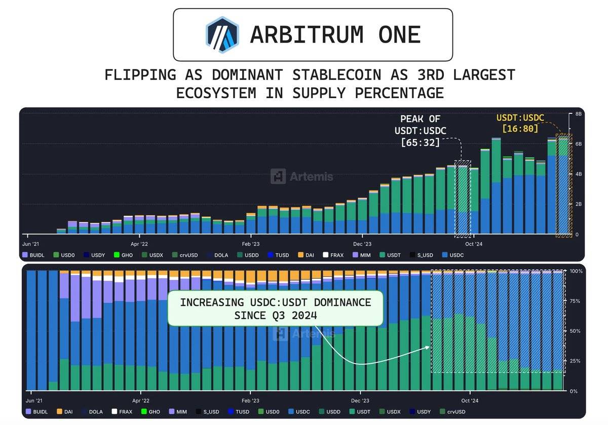 2024 年 9 月,USDC 在 Arbitrum 上悄然超越 USDT,成为主导稳定币。在其巅峰时期,USDT 与 USDC 的供应比为 2.03(即 Tether 的供应量是 USDC 的两倍多)。如今,这一比例已下降至 0.2。